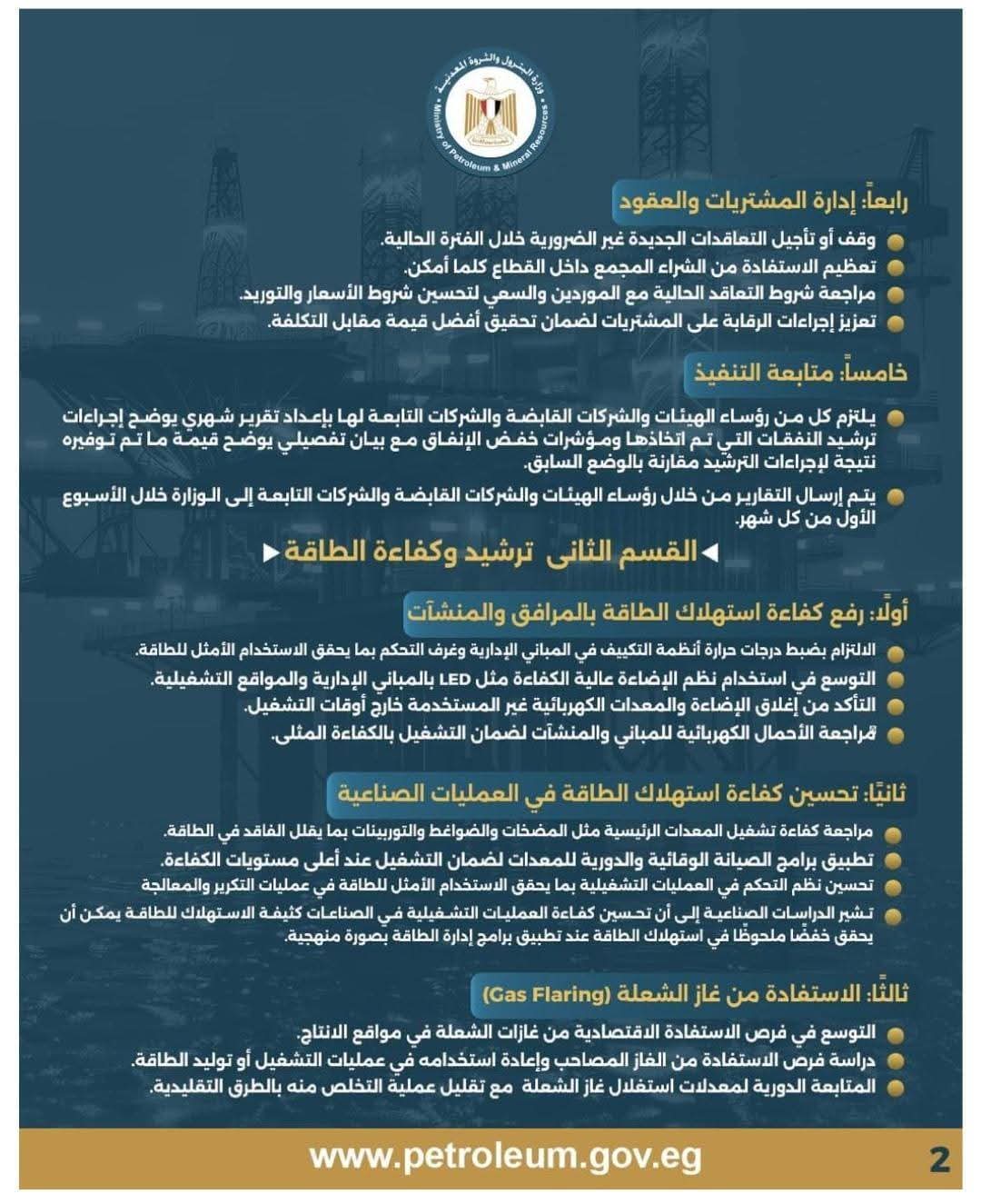 يُرجى التنبيه مشدداً بتنفيذ التعليمات التالية، على أن تكون الأولوية القصوى للمصروفات المرتبطة مباشرة بسلامة العمليات واستمرارية الإنتاج ومتطلبات السلامة والأمن الصناعي.