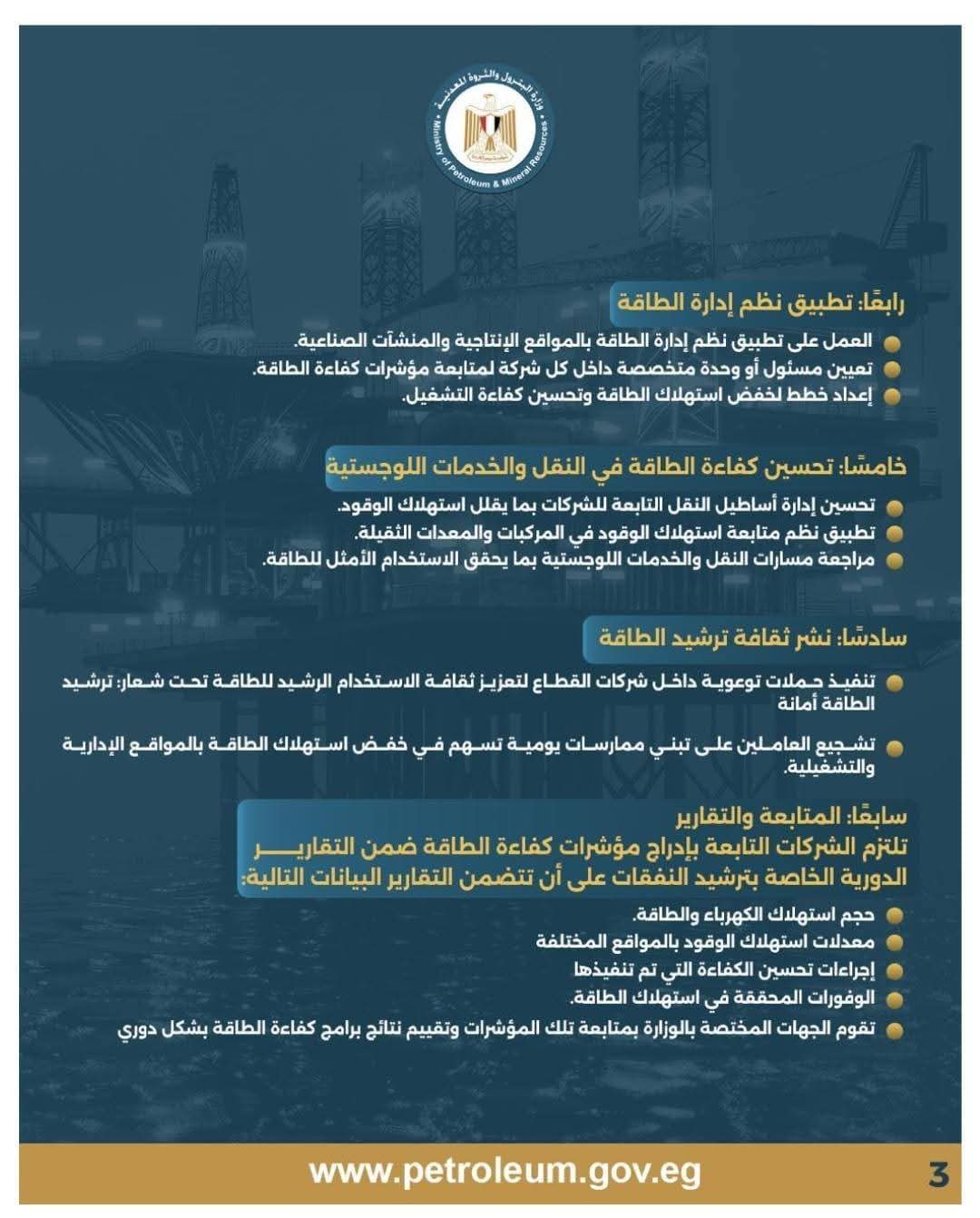 - تنفيذ حملات توعوية داخل شركات القطاع لتعزيز ثقافة الاستخدام الرشيد للطاقة تحت شعار: “ترشيد الطاقة أمانة”.
