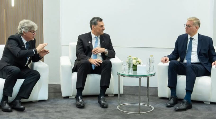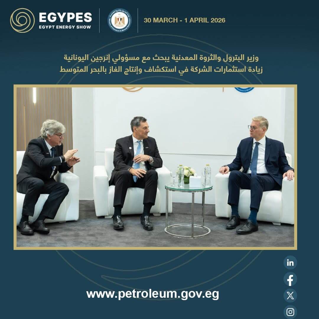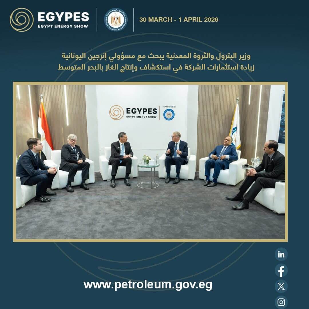 بحث المهندس كريم بدوي، وزير البترول والثروة المعدنية، مع مسؤولي شركة «إنرجين» اليونانية، سبل زيادة استثمارات الشركة في مجالات استكشاف وإنتاج الغاز الطبيعي بالبحر المتوسط، وذلك على هامش فعاليات اليوم الثالث من مؤتمر «إيجبس 2026».