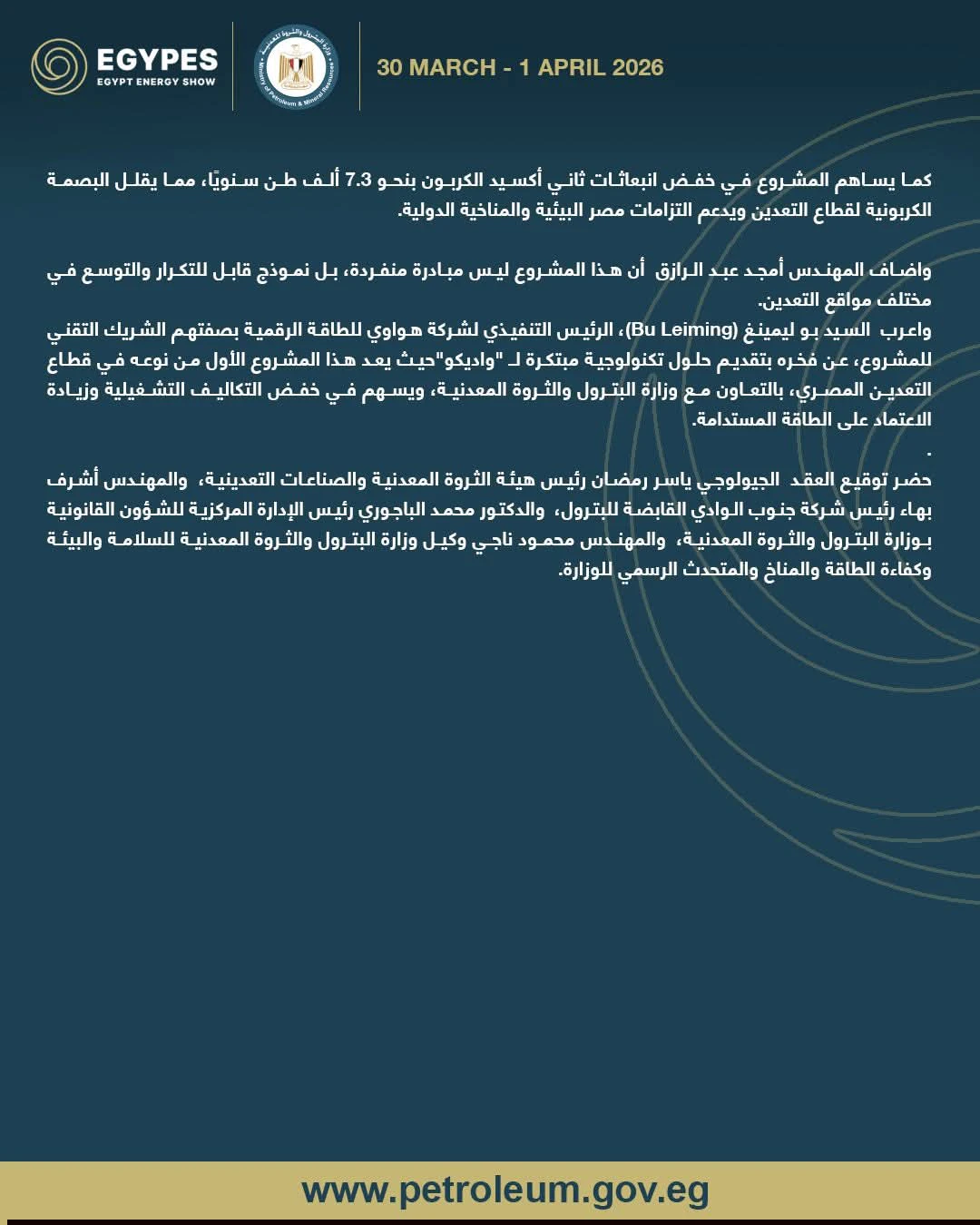 وأعرب بو ليمينج (Bu Leiming)، الرئيس التنفيذي لشركة «هواوي للطاقة الرقمية»، بصفتها الشريك التقني للمشروع، عن فخره بتقديم حلول تكنولوجية مبتكرة لـ«واديكو»، مشيرًا إلى أن المشروع يُعد الأول من نوعه في قطاع التعدين المصري، بالتعاون مع وزارة البترول والثروة المعدنية، ويسهم في خفض التكاليف التشغيلية وزيادة الاعتماد على الطاقة المستدامة.