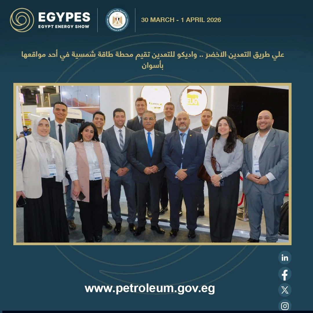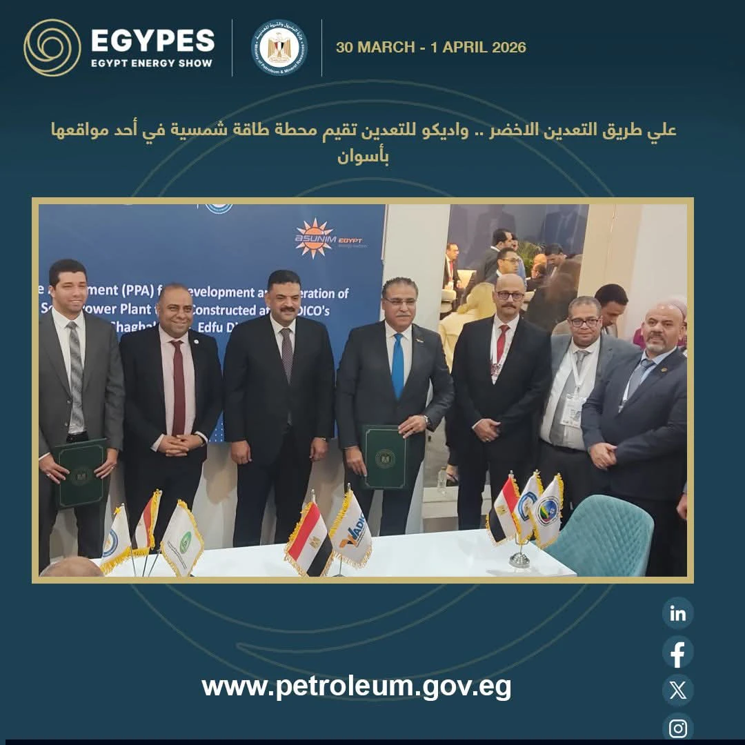 وقّعت شركة الوادي الجديد للثروة المعدنية والطفلة الزيتية – واديكو ؛ عقد إنشاء محطة طاقة شمسية، وذلك خلال فعاليات معرض ومؤتمر مصر الدولي للطاقة “إيجبس 2026” ،وذلك تنفيذًا لأهداف محوري التعدين والاستدامة البيئية ضمن استراتيجية وزارة البترول والثروة المعدنية.