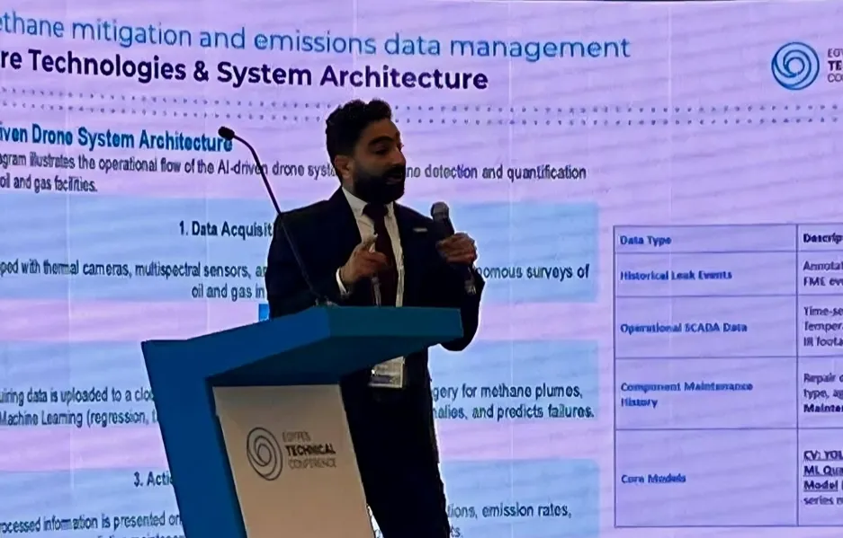 وقال الشافعي إن الحل يعتمد على دمج مصادر بيانات متعددة، تشمل الطائرات بدون طيار، وأجهزة الاستشعار الحرارية، وبيانات التشغيل الصناعية، مما يمنح رؤية شاملة ودقيقة لحالة الأصول. وأظهرت النتائج التطبيقية قدرة هذا النظام على تقليل زمن اكتشاف التسربات، خفض التكاليف التشغيلية، وتعزيز السلامة، فضلًا عن دعم الامتثال للمعايير البيئية العالمية.