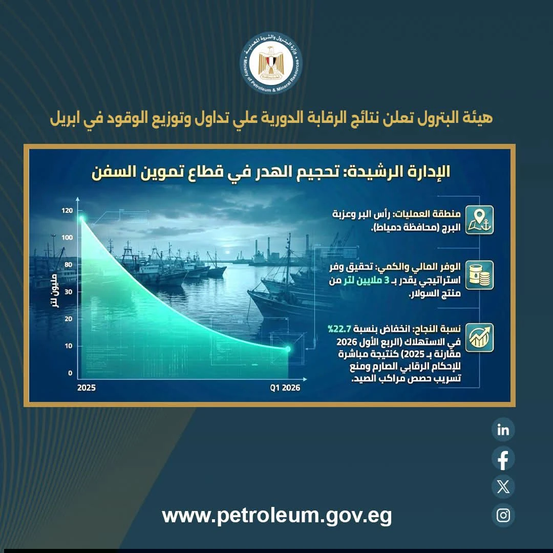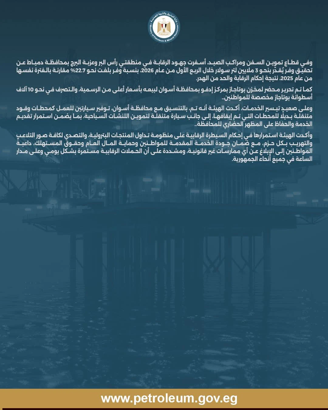 وفي قطاع تموين السفن ومراكب الصيد، أسفرت جهود الرقابة في منطقتي رأس البر وعزبة البرج بمحافظة دمياط عن تحقيق وفر يُقدَّر بنحو 3 ملايين لتر سولار خلال الربع الأول من عام 2026، بنسبة وفر بلغت نحو 22.7% مقارنة بالفترة نفسها من عام 2025، نتيجة إحكام الرقابة والحد من الهدر.