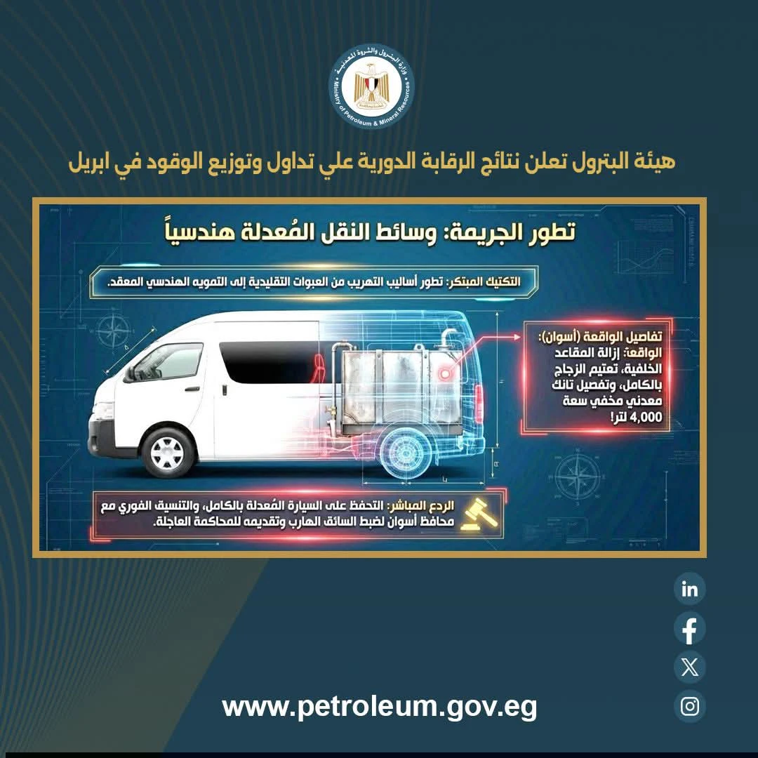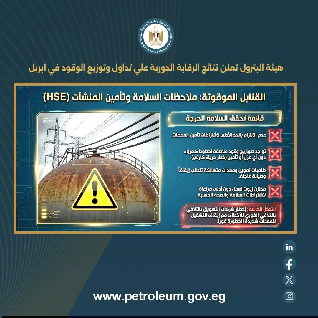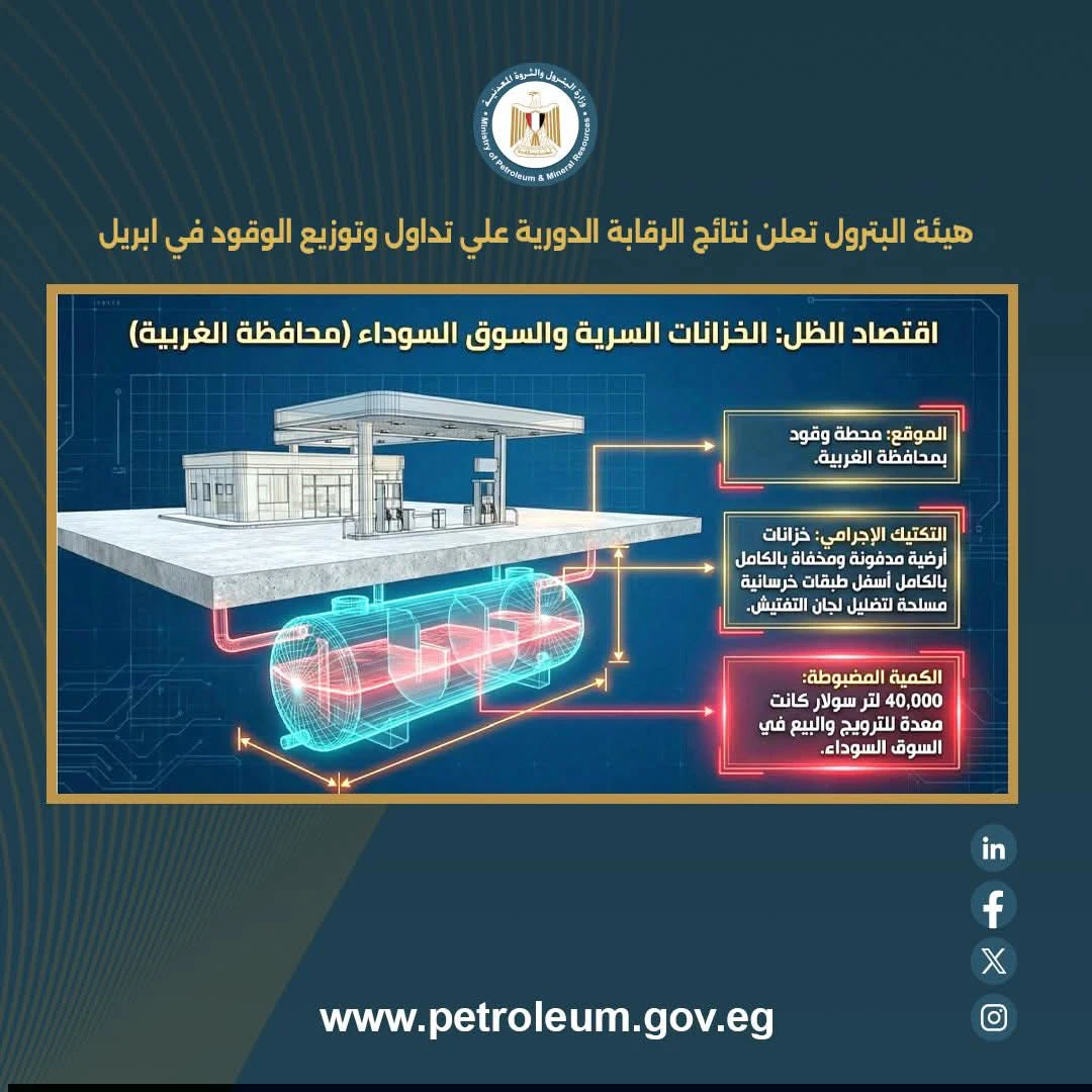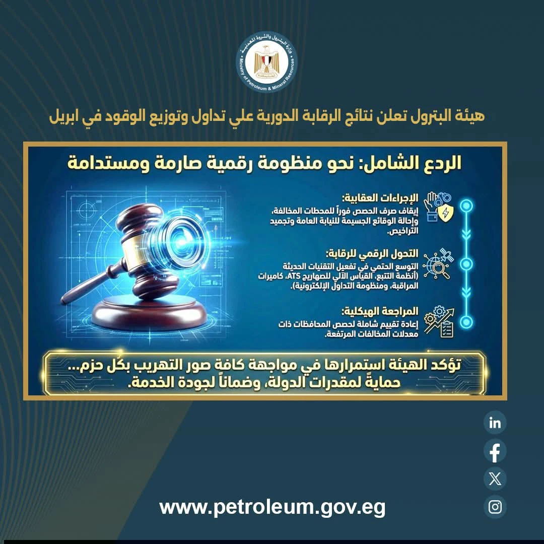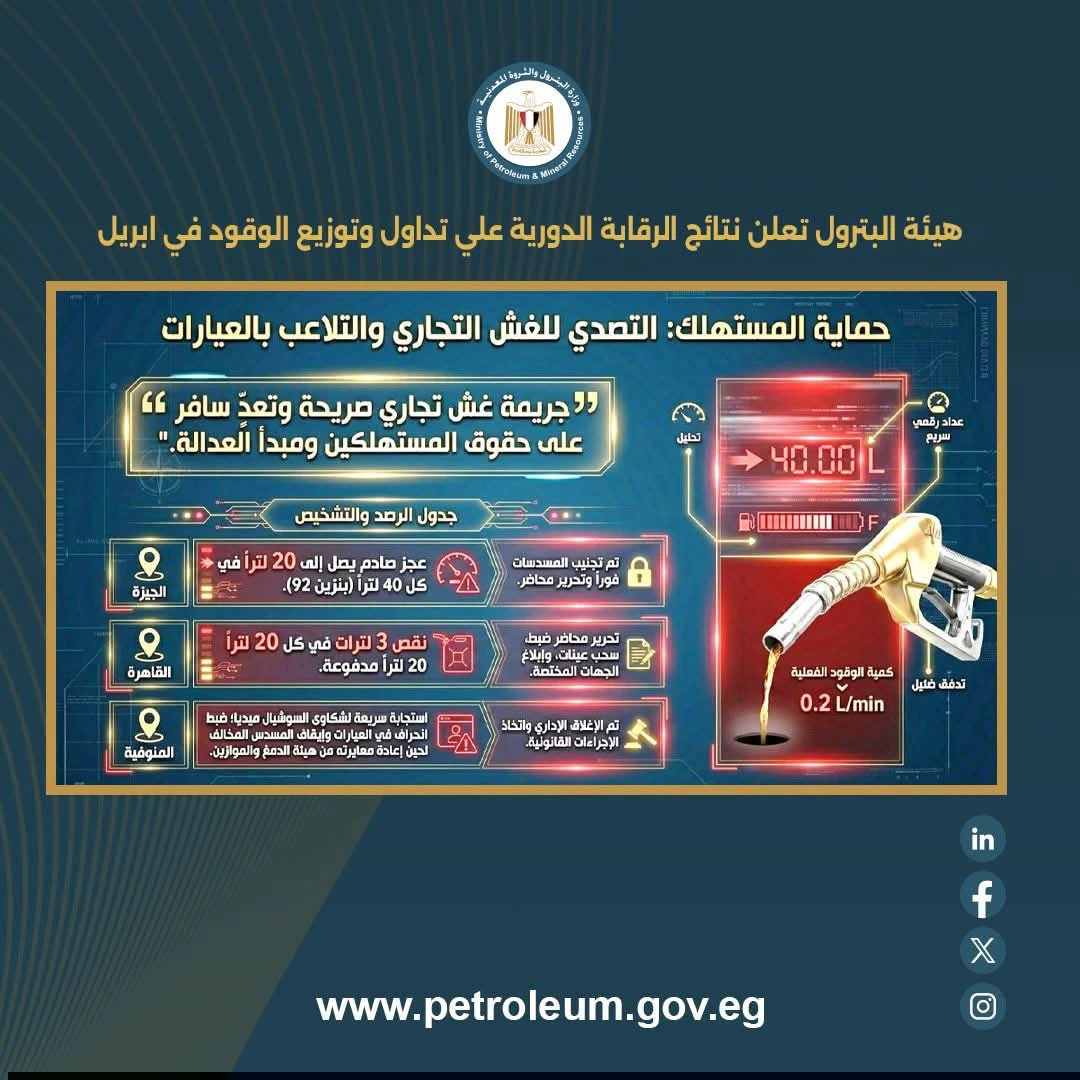 وأكدت الهيئة استمرارها في إحكام السيطرة الرقابية على منظومة تداول المنتجات البترولية، والتصدي لكافة صور التلاعب والتهريب بكل حزم، مع ضمان جودة الخدمة المقدمة للمواطنين وحماية المال العام وحقوق المستهلك، داعيةً المواطنين إلى الإبلاغ عن أي ممارسات غير قانونية، ومشددةً على أن الحملات الرقابية مستمرة بشكل يومي وعلى مدار الساعة في جميع أنحاء الجمهورية.