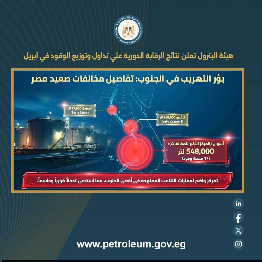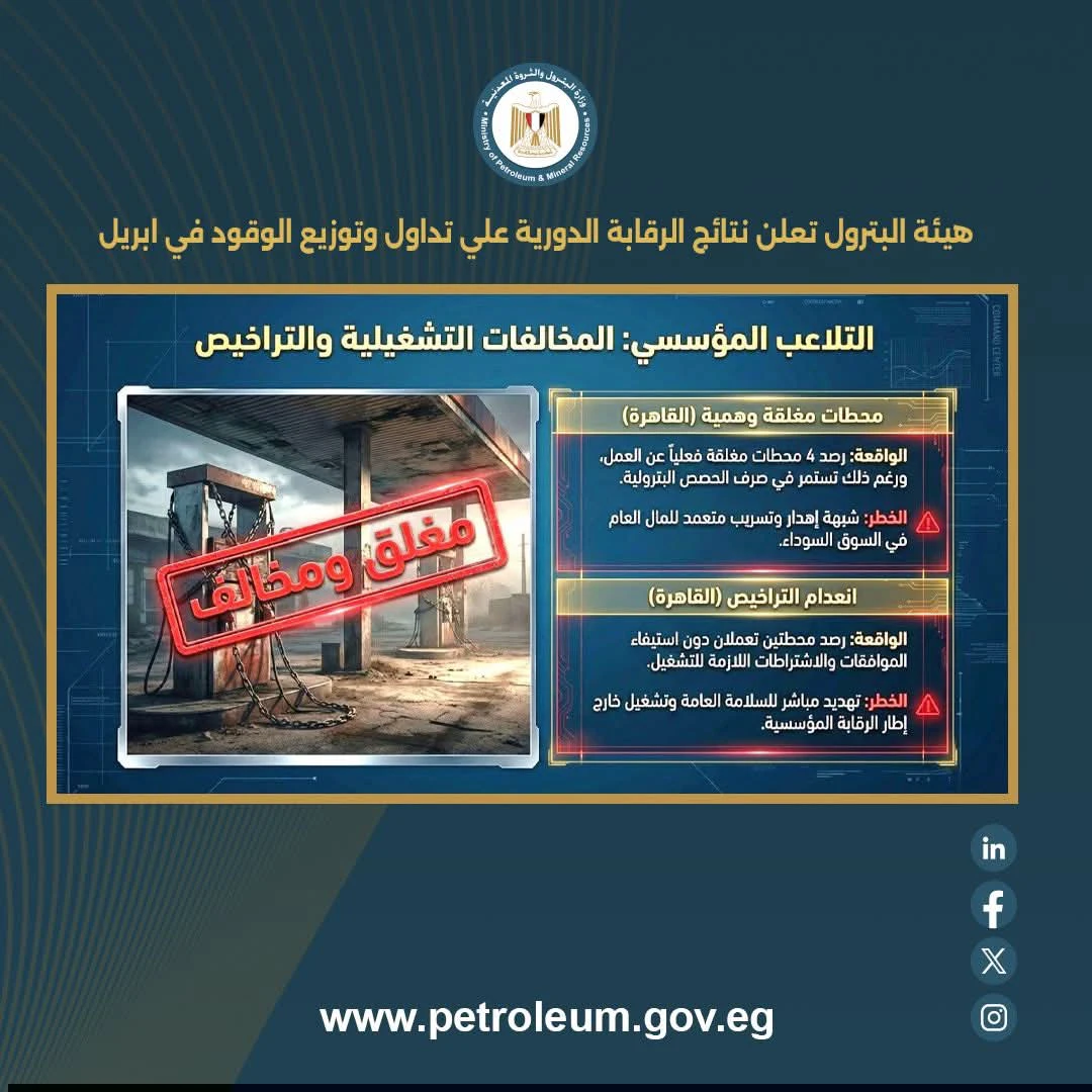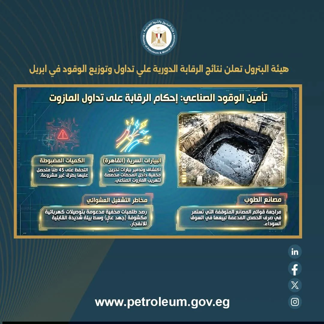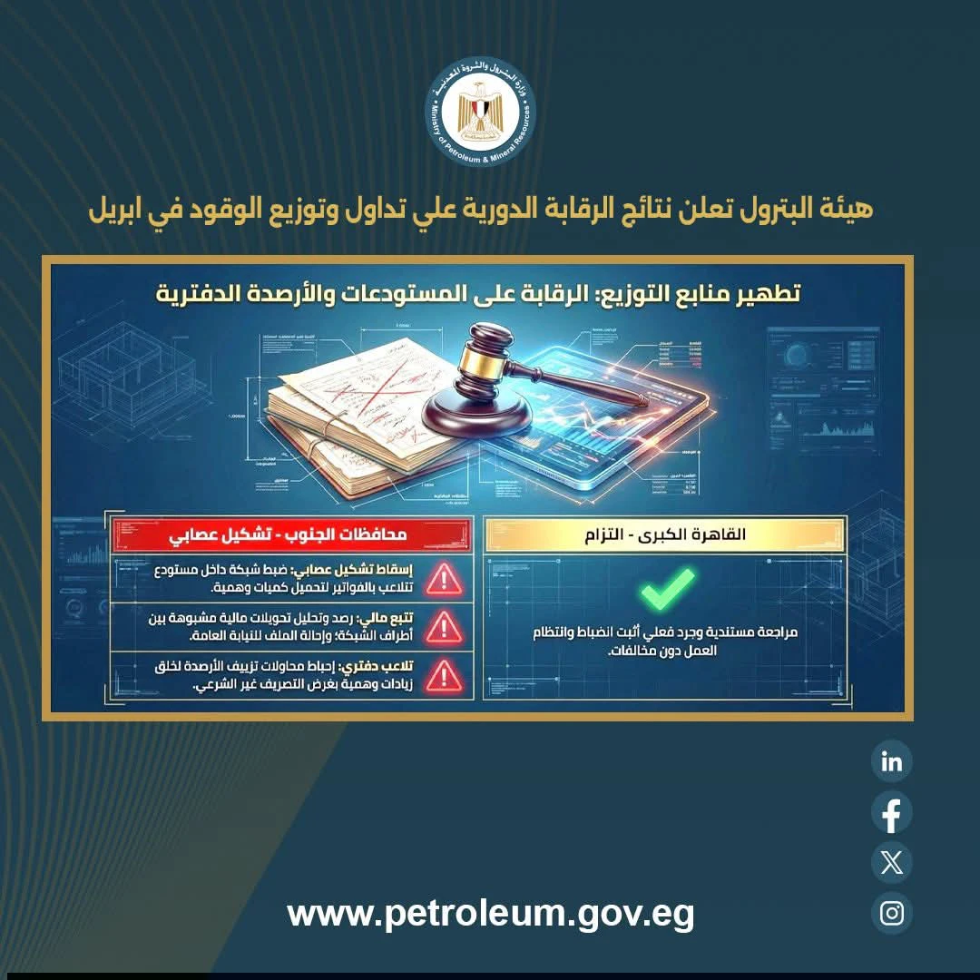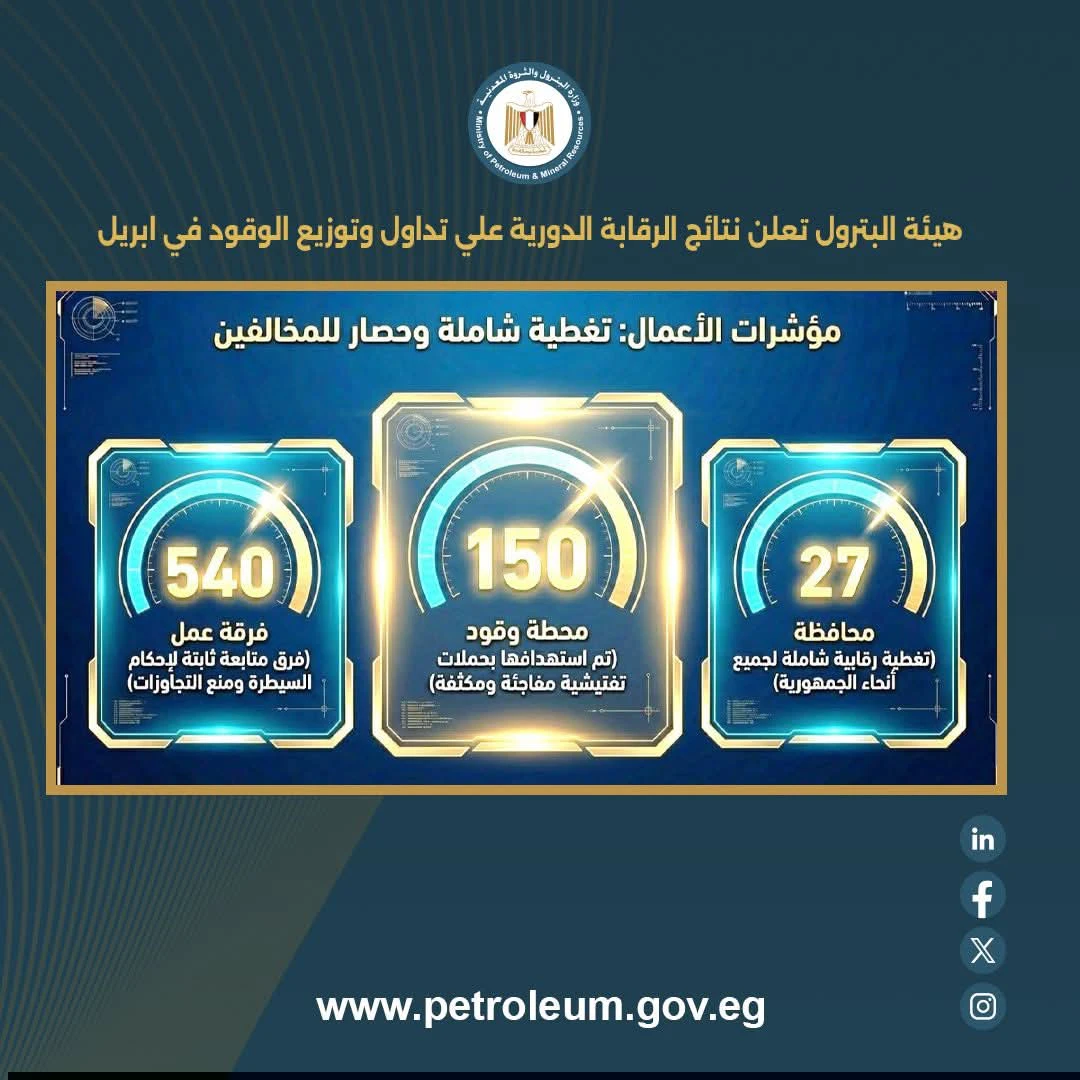 وأكدت الهيئة استمرارها في إحكام السيطرة الرقابية على منظومة تداول المنتجات البترولية، والتصدي لكافة صور التلاعب والتهريب بكل حزم، مع ضمان جودة الخدمة المقدمة للمواطنين وحماية المال العام وحقوق المستهلك، داعيةً المواطنين إلى الإبلاغ عن أي ممارسات غير قانونية، ومشددةً على أن الحملات الرقابية مستمرة بشكل يومي وعلى مدار الساعة في جميع أنحاء الجمهورية.