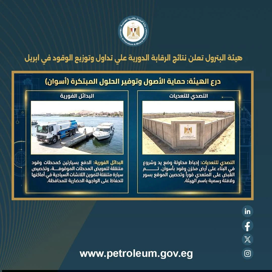 وعلى صعيد تيسير الخدمات، أكدت الهيئة أنه تم، بالتنسيق مع محافظة أسوان، توفير سيارتين للعمل كمحطات وقود متنقلة بديلًا للمحطات التي تم إيقافها، إلى جانب سيارة متنقلة لتموين اللنشات السياحية، بما يضمن استمرار تقديم الخدمة والحفاظ على المظهر الحضاري للمحافظة.