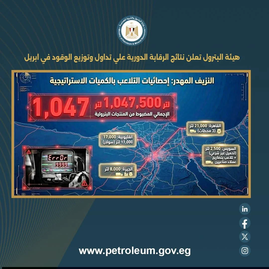 كشفت الهيئة المصرية العامة للبترول عن نتائج الحملات الرقابية الميدانية المكثفة التي نفذتها اللجنة المركزية للرقابة على تداول المنتجات البترولية، بالتعاون مع الجهات المعنية، خلال شهر أبريل 2026، والتي أسفرت عن ضبط تلاعب في كميات المنتجات البترولية تجاوز مليون لتر بعدة محافظات.