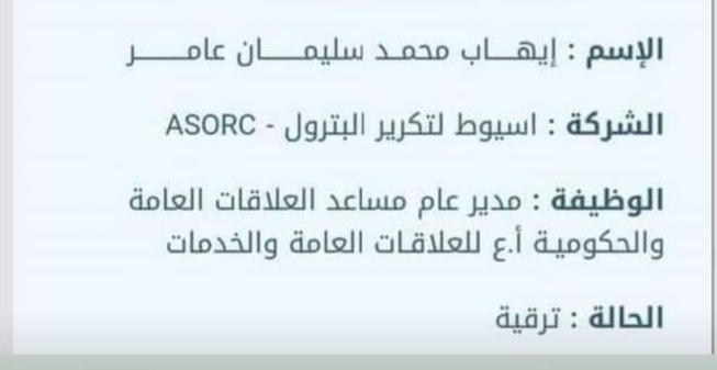 خالص التهنئة للأستاذ / ايهاب محمد سليمان عامر لترقيته إلى مدير عام مساعد العلاقات العامة و الحكومية بالإدارة العامة للعلاقات العامة و الخدمات بشركة أسيوط لتكرير البترول .