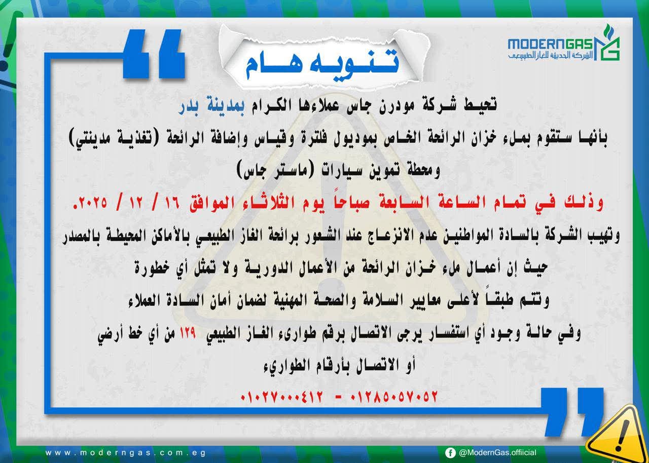 أعلنت الصفحة الرسمية للشركة الحديثة للغاز الطبيعي “مودرن جاس” لعملاء مدينة بدر عن قيام الشركة بأعمال ملء خزان الرائحة الخاص بموديول فلترة وقياس وإضافة الرائحة (تغذية مدينتي) ومحطة تموين (ماستر جاس)، وذلك في تمام الساعة السابعة صباحاً يوم الثلاثاء الموافق 16 / 12 / 2025.